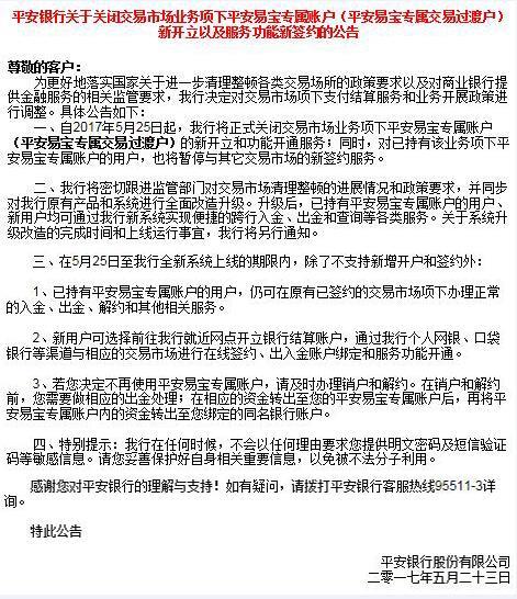 1、自2017年5月25日起,平安銀行將停止新開立平安易寶賬戶;